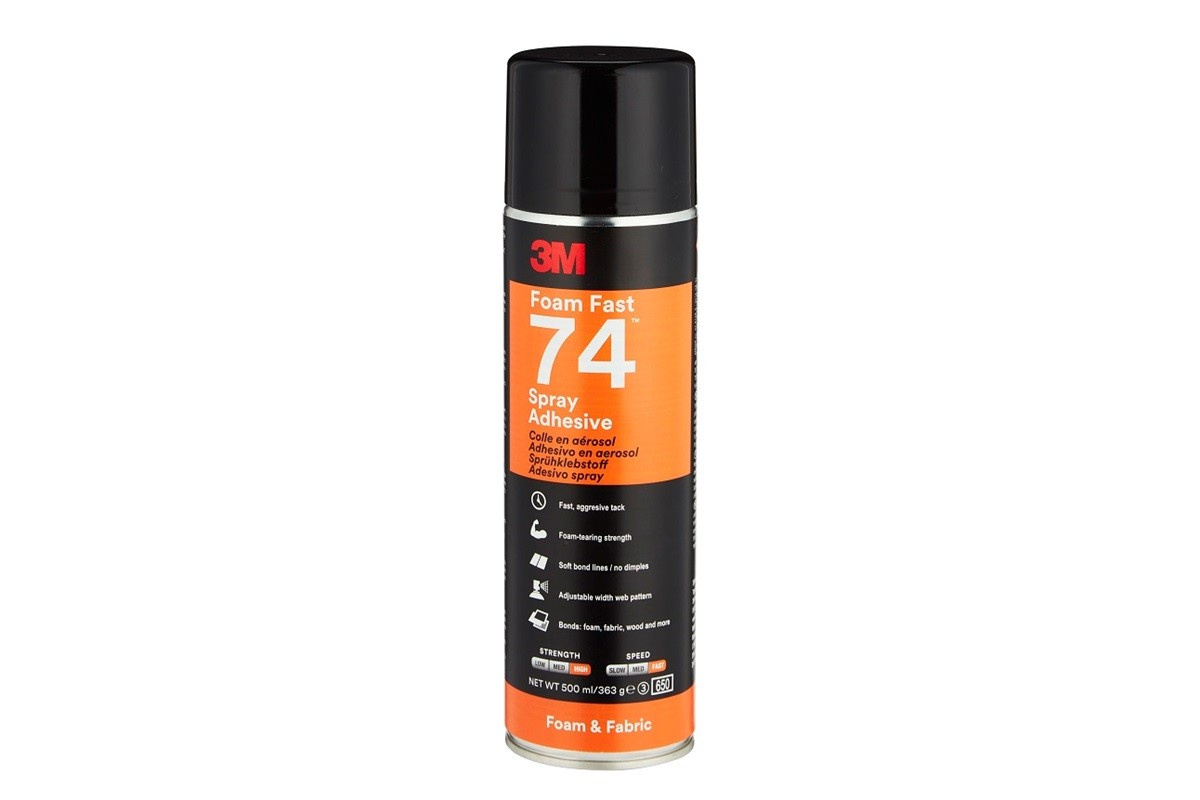 Špičkové rýchlo priľnavé sprejové lepidlo 3M Scotch-Weld 74 lepí pružné polyuretánové alebo latexové peny k sebe aj k iným materiálom (drevu, kovu, plastom atď.).