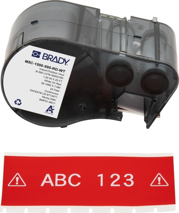 Brady M5C-1500-595-RD-WT / 170943, 38.10 mm x 7.62 m, Vinyl, biela tlač / červený podklad