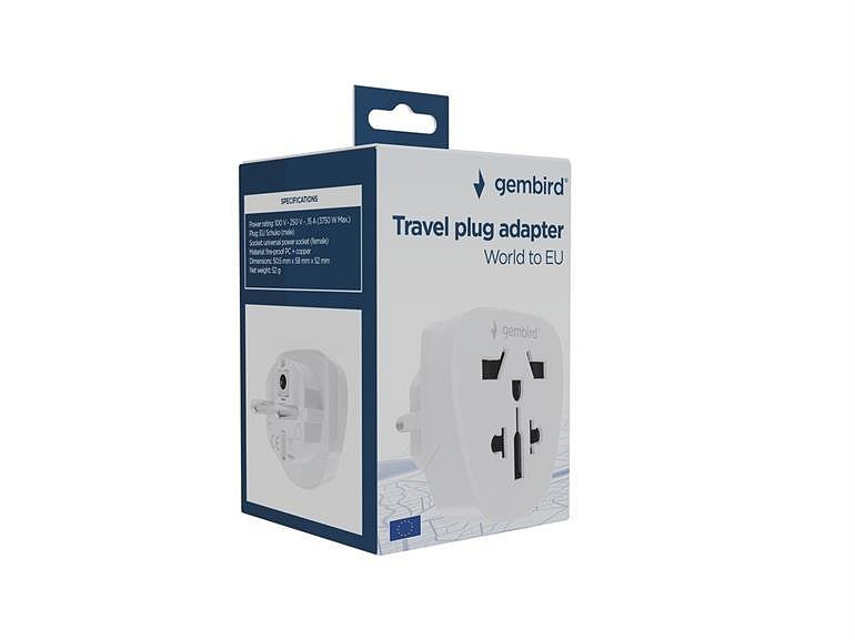 Tento adaptér umožňuje pripojenie akéhokoľvek elektrického zariadenia k štandardným zásuvkám EÚ. Funguje so zástrčkami z viac ako 200 krajín. Vlastnosti Cestovný adaptér Uzemnená zástrčka pasuje do akejkoľvek štandardnej zásuvky v EÚ. Univerzálna zásuvka akceptuje zástrčky z viac ako 200 krajín. Špecifikácia Menovitý výkon: 100–250 V AC, 15 A (max. 3750 W). Zástrčka: EÚ Schuko (male). Zásuvka: Univerzálna zásuvka (female). Materiál: Ohňovzdorný PC + meď. Rozmery: 50 x 49,5 x 49,5 mm. Čistá hmotnosť: 53 g.