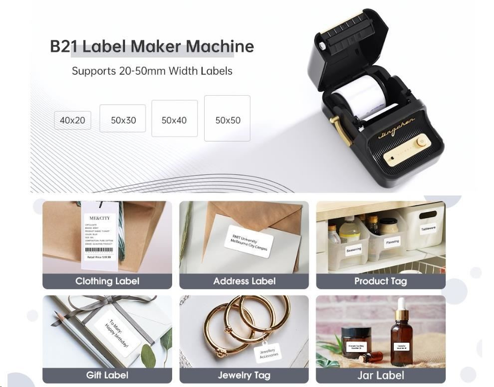 Tlačiareň štítkov Niimbot Smart B21 1AC19051601, USB-C nabíjací kábel, sada bielych samolepiacich štítkov Niimbot 50 x 30 mm (210 ks), používateľská príručka