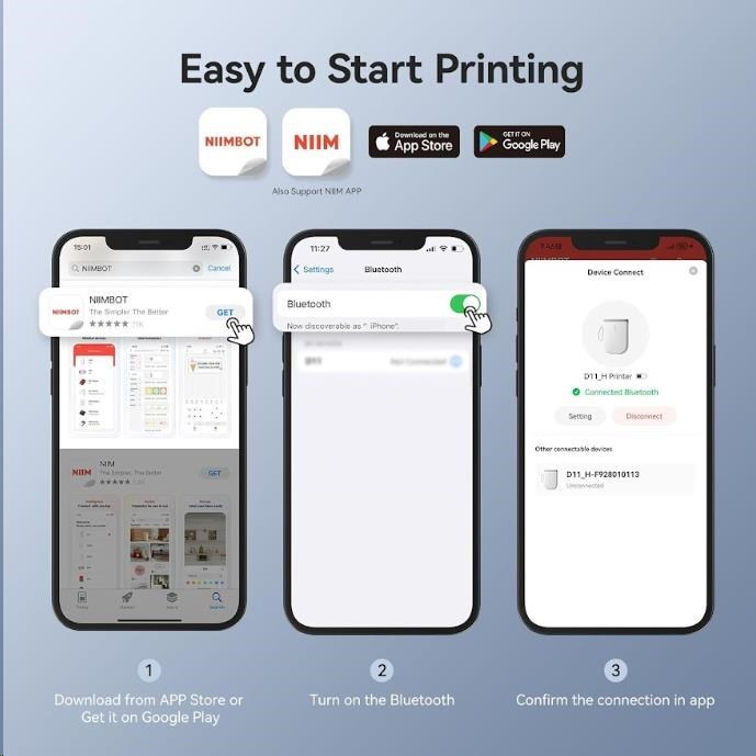 Vďaka Bluetooth pripojeniu a výkonej lítiovej batérii s kapacitou 1500 mAh umožňuje štítkovač Niimbot D11-H Smart tlač etikiet až 5 hodín na jedno nabitie. Je kompatibilný s aplikáciou Niimbot App dostupnou pre Android aj iOS, takže môžete pohodlne navrhovať a tlačiť štítky priamo zo svojho smartfónu alebo tabletu.