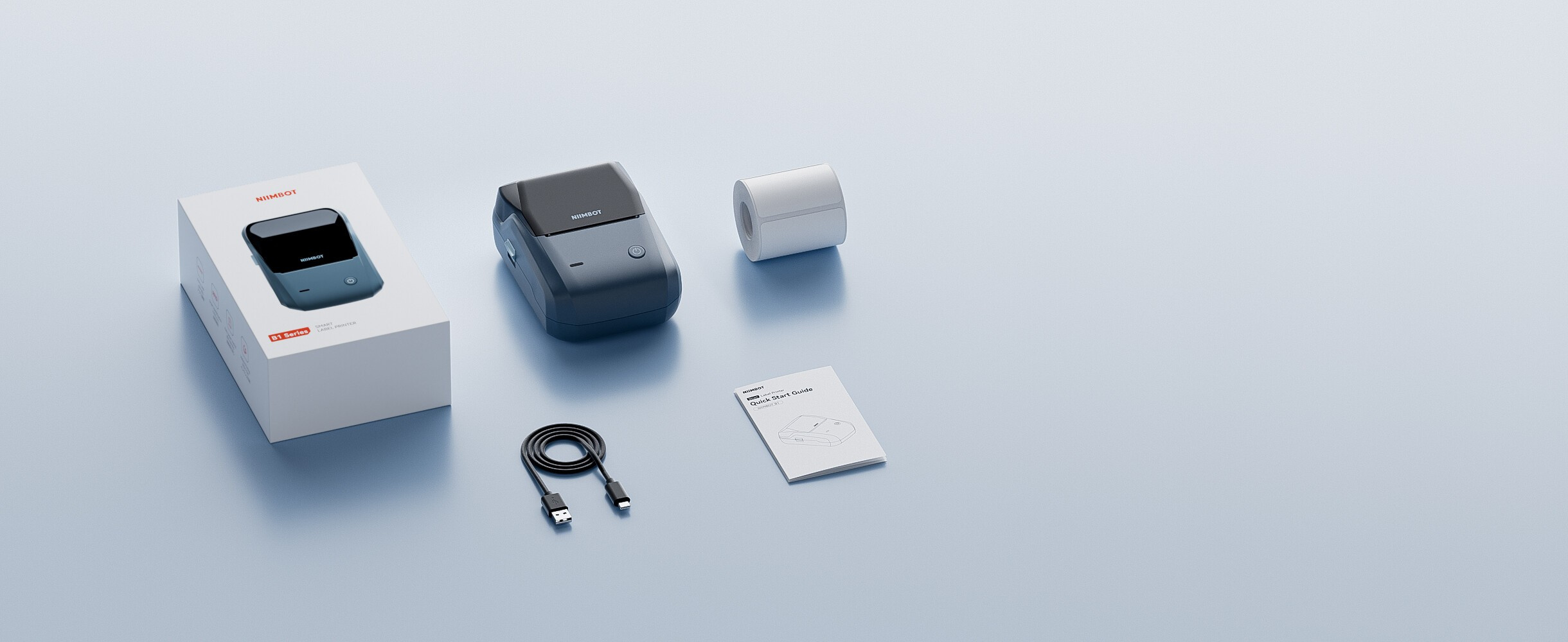 Tlačiareň štítkov Niimbot Smart B1 1AC12121602, USB-C nabíjací kábel, rolka štítkov, používateľská príručka