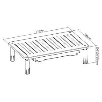 Špecifikácia Vhodný pre: notebook, monitor Vhodná veľkosť obrazovky: 13" ~ 32" Nastaviteľná výška: 10/12/14 cm Materiál: oceľ + plast Rozmery: 370 x 235 x 140 mm Hrúbka povrchu: 0,9 cm Nosnosť: 20 kg