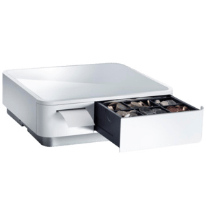 Cash drawer-receipt printer combination, front opening, dimensions (WxHxD): 308x100x300mm, insert: 4 bill, 6/8 coin, 1 check, printer: direct thermal, media width (max): 58mm, roll diameter (max): 50mm, printing speed (max): 100mm/sec, interfaces: 3x USB-A, 1x USB-C (for iOS), 1x USB-B, Bluetooth (5.0), includes: Power cable (EU, UK), USB cable (USB-A/USB-B, white), tablet holder (double-sided), receipt roll, color: whiteNa stiahnutie